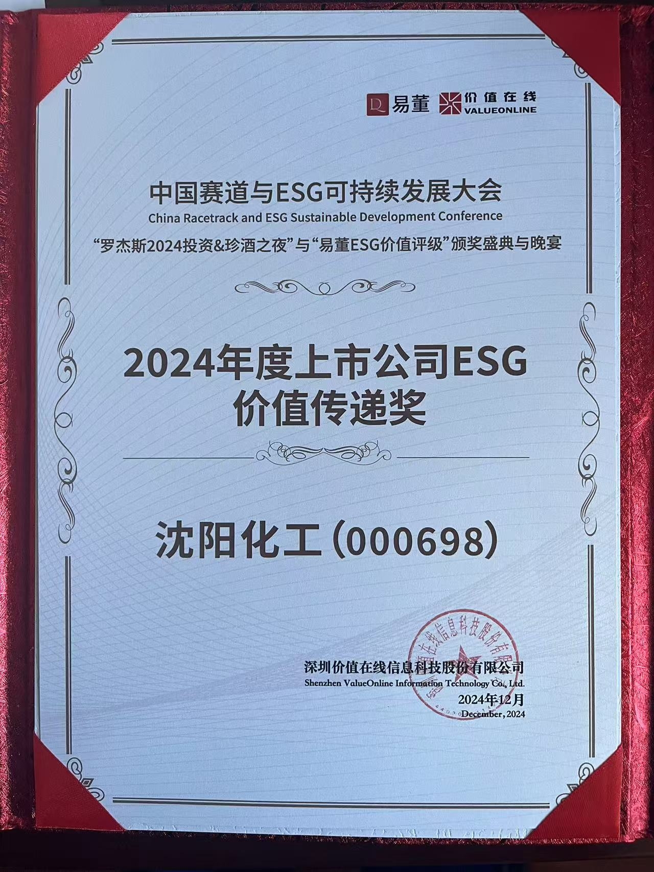 12月7日—8日,由價(jià)值在線和亞洲商務(wù)大學(xué)堂主辦,以“投資光明,共創(chuàng)未來”為主題的“中國賽道與ESG可持續(xù)發(fā)展大會(huì)”在深圳市光明區(qū)召開。數(shù)百家上市企業(yè)代表云集,聚焦綠色創(chuàng)新,共同探索經(jīng)濟(jì)高質(zhì)量發(fā)展路徑。大會(huì)發(fā)布2024年度易董ESG+8“價(jià)值100榜單”,沈陽化工股份有限公司(以下簡稱“沈陽化工”)憑借其在環(huán)境、社會(huì)及公司治理(ESG)領(lǐng)域的卓越表現(xiàn),成功榮獲這一殊榮。此前,沈陽化工已獲得“國新杯·ESG金牛獎(jiǎng)”,此次獲獎(jiǎng)為沈陽化工于本年度在ESG工作領(lǐng)域收獲的第二大獎(jiǎng)項(xiàng)。